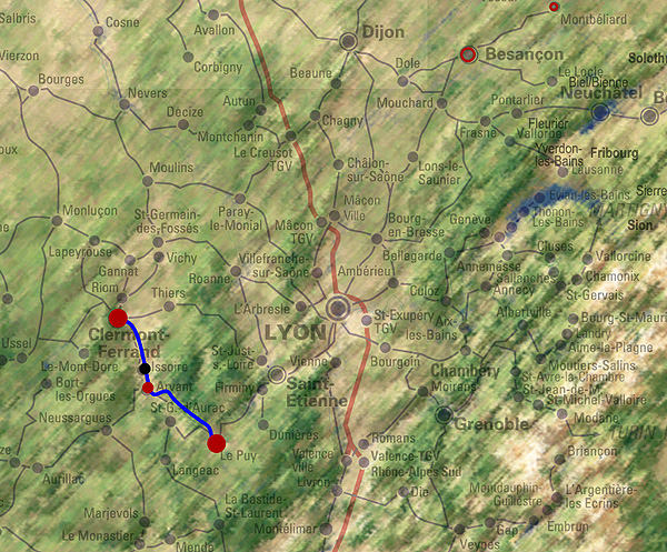The next morning, I was off to Le Puy (luh-PWEE, pop. ~21,000), consulting my Michelin map of France (alas, not a region-specific one) and my copy of the Rough Guide almost compulsively to learn about each new place that the train passed through.